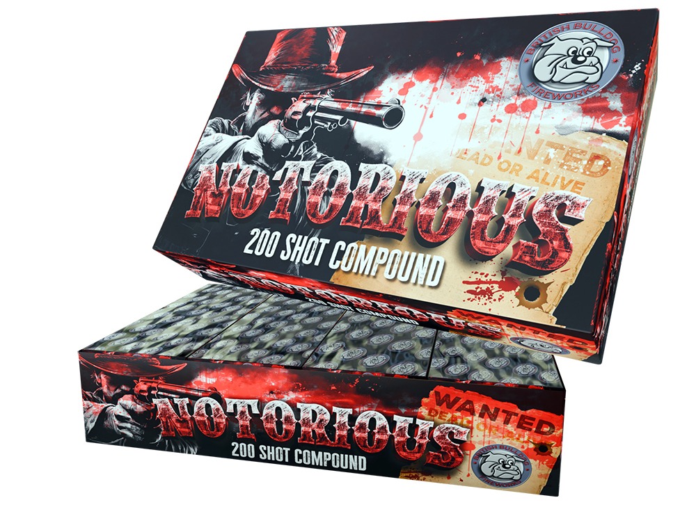 British BulldogNotorious 200 Shot Compound 4152 Notorious 200 Shot Compound 1 piece per carton 1.3GHazard 25mSafety Distance RRP: £399.99 Downloads Image Downloads Notorious-Render-hires Notorious-Render-lowres Download Video